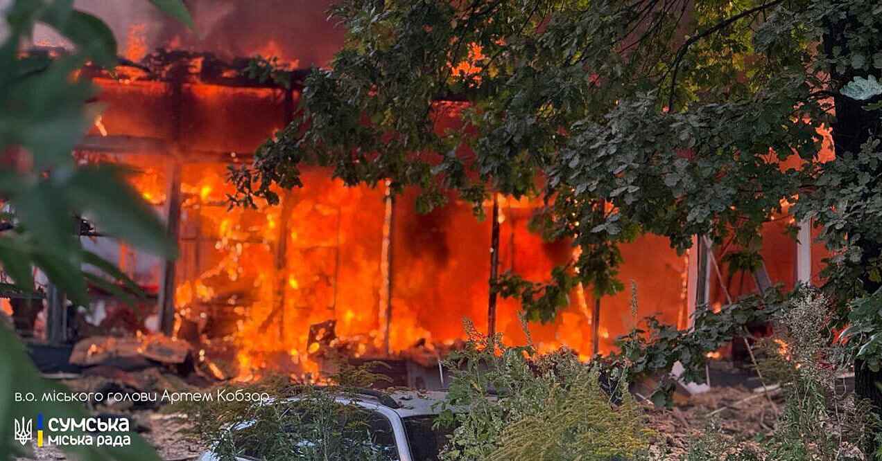 У місті Суми лютує пожежа в нежитловому приміщенні внаслідок російського удару дронами вранці 12 вересня. Про це заявили в.о. міського голови Сум Артем Кобзарь та голова ОВА Олег Григоров."Два вибухи, які сьогодні чули всі в місті, — це приліт ворожих безпілотників по нежитловому приміщенню. Інформація про поранених або загиблих уточнюється", – повідомив голова міста.t.me/hryhorov_olegЗа словами голови ОВА Олега Григорова, у палаючому будинку міг перебувати охоронець, з ним поки що немає зв'язку.Через загрозу повторних ударів фахівці ДСНС не можуть розпочати рятувально-пошукові роботи та ліквідацію наслідків. Пізніше Григоров додав, що на місці попадання ворожих ударних БпЛА в Сумах тривають аварійно-пошукові роботи та ліквідація наслідків атаки."Залучені всі екстрені служби", – зазначив голова ОВА.