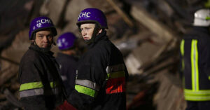 Поліцейські евакуювали поранену жінку з-під завалів після того, як росіяни завдали серію авіаударів керованими...